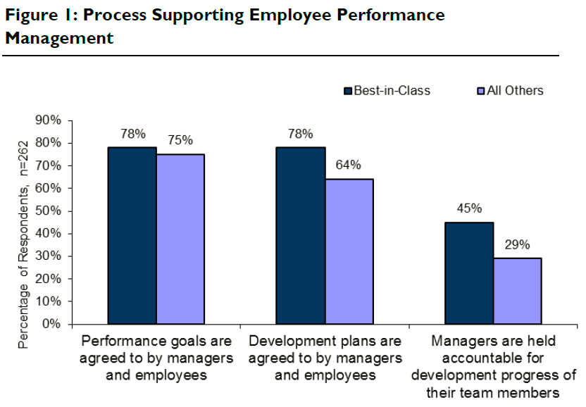 A recent research brief from Aberdeen Group shows that best-in-class companies have managers and employees jointly develop performance goals and growth plans, and managers are held accountable for growth progress of team members.