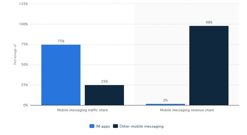 According to Statista.com, "in 2018, IM apps such as WhatsApp or LINE are projected to account for 75 percent of all mobile messaging traffic, ahead of SMS or mobile email and other mobile messaging options." This is a forecast regarding the instant messaging app share of mobile messaging traffic and revenues worldwide.